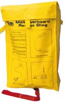Rescue sling utilising a helicopter lifting strop with 30m floating yellow line and light. Simple instructions are printed on both sides of the PVC bag. The bag has been specially designed for easy fitment to a guardrail.